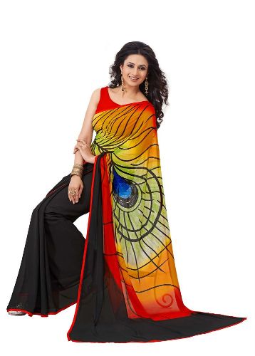 - Saree Design: Black Georgette Saree With Peacock print Palla