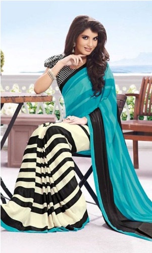 Black and white stripes are in vogue right now and what better way to express your sense of style then in this crepe number. The fresh, crisp black and white print set next to the turquoise blue of the palla gives this saree an almost nautical allure. Look modern and stylish as you step out for a day out with the girls.