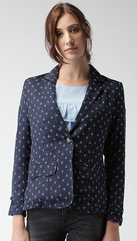 This dark blue printed denim jacket has a scored lapel, single-breasted with catch terminations on the front. It has long sleeves with two stashes, two pockets and an opening on the back. Those who love having a bit of quirk on normal denim can try this style out. This printed blazer is quite unusual and new in trend, so surely you would rock in this style.
