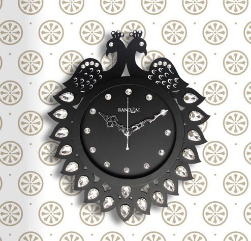 This black wall clock gives an ethnic look to your home. The clock has two beautifully carved peacocks that are studded with shining white crystal stones. The 12 digits in the clock are replaced with pretty round white stones and for the hands, two intricately carved metals have been used.