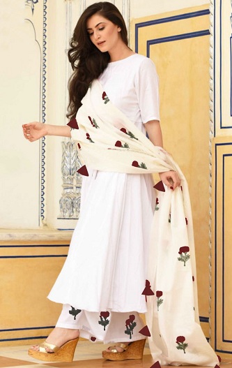 This is one of the most aesthetically designed outfits in the floral print segment. The pure white Frock style Kurta is tastefully paired with a floral printed palazzo and dupatta. The hints of red and grey over the sober background can make you look like a diva. Wear it with wedge heels and matching accessories.