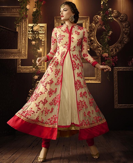 - Design: Cream and Red Floral Anarkali Style Salwar Kameez