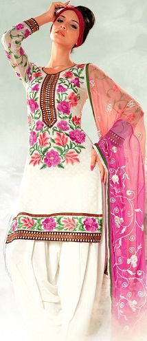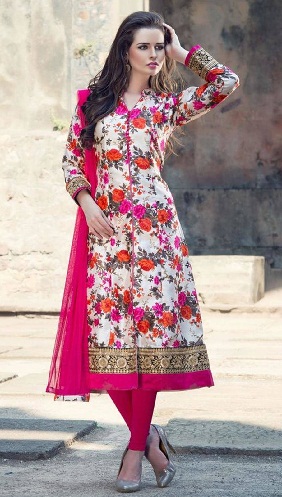 The whites are an all-time favourite in summers. The whites impart a rich look and give you a royal elegance. While a floral print salwar suit in the white colour with floral colours neck and border and are designed to look pretty. The pink dupatta looks eye-catching in the floral print salwar suit design.