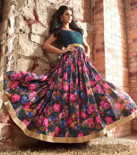 The choli suit style of designer salwar suit of the full ravishing and stunning style is one of the wedding style choices or the red carpet glamour type. The multi-coloured flare and the plain choli looks like a brilliant combination of colours and style. The skirt is stitched with an overall floral print, and the kameez will look dynamically awesome.