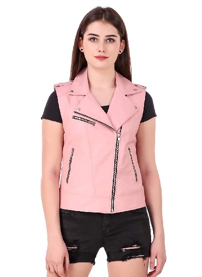 - Jacket Pattern and Sleeve Design: Pink Color Sleeveless Leather Short Jacket