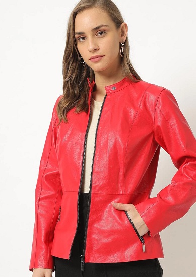 - Jacket Pattern and Sleeve Design: Red Color Leather Full Sleeve Jacket