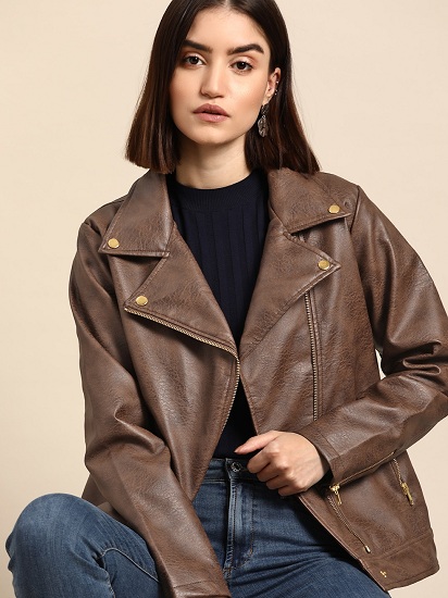 We love this casual yet hot and stylish look. The brown colour biker jacket for women comes with a cropped length and full sleeves, with a spread collar. It looks stunning and adds to the edgy and chic appearance. Right from any occasion and casual events and outings to special ones, this biker jacket will add value and style seamlessly.