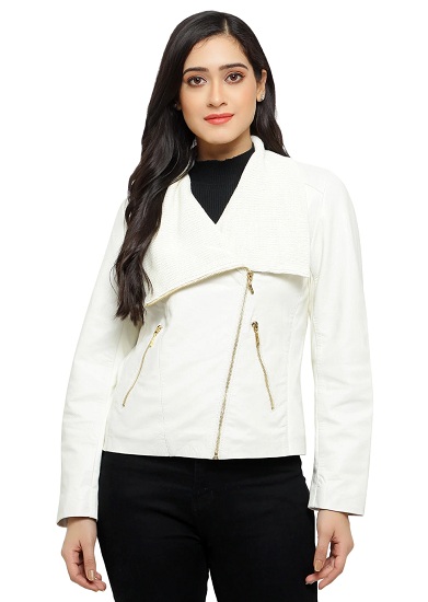 There is no colour as elegant and exquisite as white. This white leather jacket with a front zip for women redefines the sensual and sophisticated plush looks. It brings grandeur and a royal vibe quickly and effortlessly. This leather jacket can layer up with other outfits or match it with other monochrome white skirts and trousers.