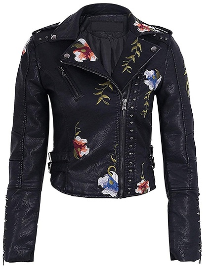For those who prefer more feminine statement appearances, this embroidered faux leather lining black jacket for women is perfect. The design includes floral embroidery with intricate detailing, long sleeves, and lapel collar. If you want something unique, this is a must-try one.