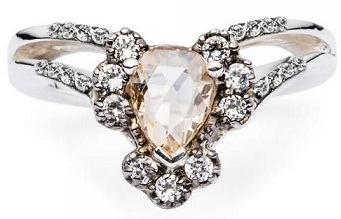 Ethnic designs have always been adorable to carry on. A ring design, when given an ethnic look, gives a classy look. A ring diamond of brownish colour and teardrop shape is fixed in a white gold ring with several tiny diamonds around it. Western brides widely wear it as a wedding gift, a part of the marriage ritual from the boy’s family.