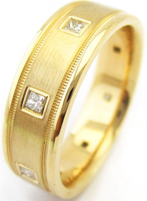 Want to have a simple but sensual gift for your to-be husband? Look at the bold and elegant design of a diamond engagement ring. The ring is gold and studded with a diamond at a fixed gap. The design gives a simplified personality to the wearer. When worn on the ring finger, it represents protection, deep love, sensuality, attraction and leadership.