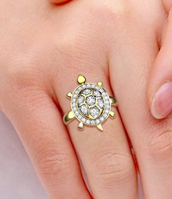 The tortoise is said to be a symbol of love and good luck. A diamond ring design with a tortoise design is worn on the index finger. The design is made with gold carrying a tortoise studded with diamonds. The design is worn for regular wear. It symbolises love, good luck, creation and wisdom. The ring when gifted to someone special for occasions like marriage, religious functions, small occasions etc.
