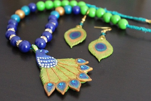 There are various necklace set designs. The most standard necklace set designs come in terracotta designs with peacock feather design that are made with attractive colour. This necklace set is glided with embellishing peacock pendant will give the soft and delicate look. This necklace set is a great piece for occasion and wedding wears. There is an adjustable hook available; this gives a trendy and classy look.