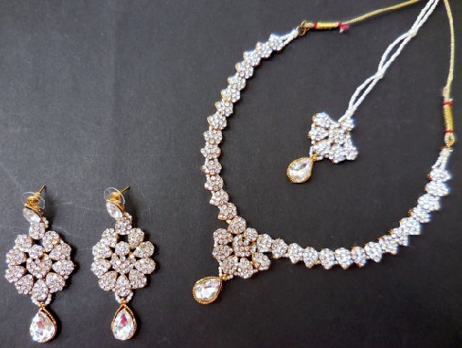 This handmade necklace set with two matching earrings one of the popular styles is gorgeous neck chain. You might be surprised to hear that chain necklaces have been around for a very long time. This is a unique handmade item from silver plated materials along with the crystals and diamond stones. This necklace set has the complex design and it can be used by women for all occasions from weddings to parties.