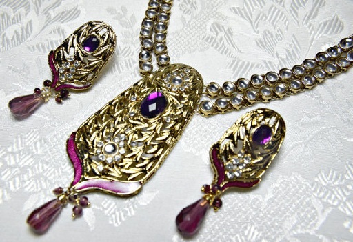 Art deco necklace set was very familiar from the early 1920’s which was gold plated in the magenta purple colour will be really giving the sophisticated looking when worn at any occasion. Also this was attached with the lovable matching magenta organza ribbon which will let the wearer to adjust the wearing when needed. You can get many colours with this version of necklace sets.