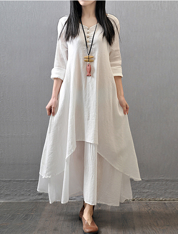 One of the latest trendy outfits is the bohemian style cotton maxi dress with an underskirt. The dress has an asymmetric hemline and the underskirt is flowing. This dress has full sleeves that are stylishly rolled up. Simple accessories enhance the style of this dress.