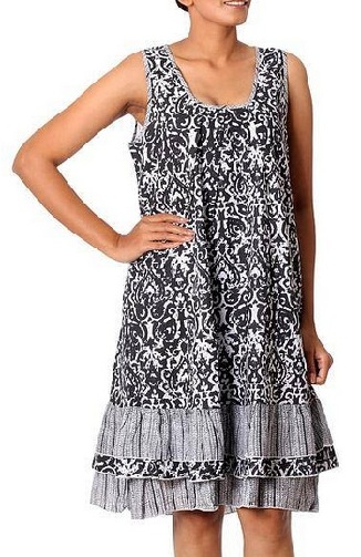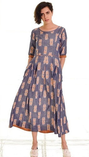 Cotton dresses are normally printed with the block print design. This is a Rajasthani design that is popular among the Indian and foreign fashion world. This block print cotton dress design is long and has short sleeves. The dress is fitted with a thin belt at the waist. Block prints are normally floral and some also come in abstract designs.