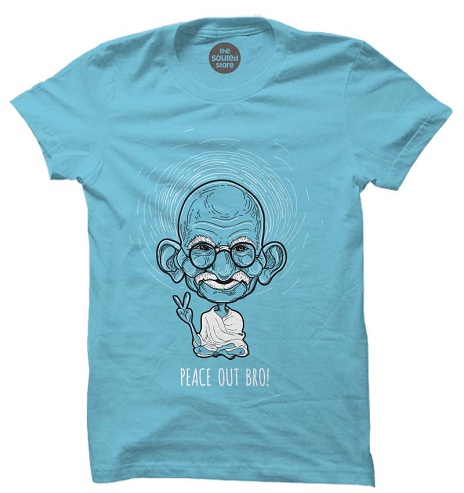 One of the main design ideas in funky t shirts for men is the character Mahatma Gandhi with his peace message in a cool blue t-shirt print. These real-life or cartoon characters are depicted in a funky way. Here you have the character of Mahatma Gandhi.