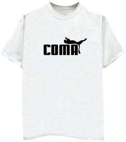 Some funky tee shirts also play with the logo of a brand. Here the Puma brand name and logo is changed to Coma. These changes in a brand and logo are very popular in funky t shirts.