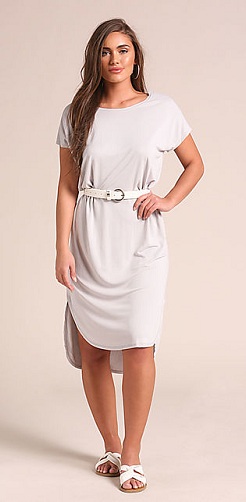 This white day dress has both side apple cut. It is loosely fitted with short sleeve and white belt with circular buckle on waist. With apple cut the dress is combined with up and down style. This white dress is contemporary and modern.