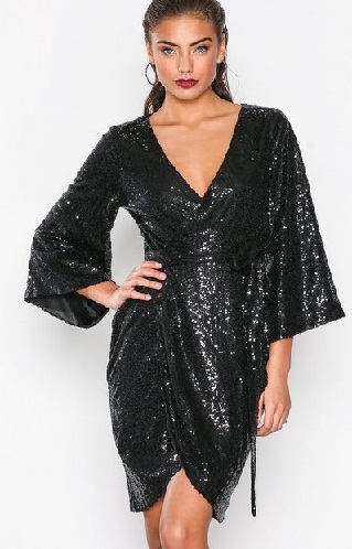 This black wrap dress contains sparkling features. The wrap of the dress goes till knee where also wrapping is done with fabric. The sleeves are very broad and wide. The dazzling quality of dress makes it the highlight of the show.