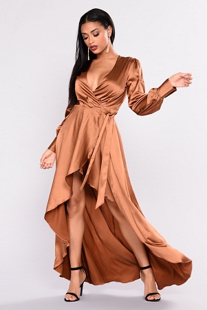 It is a satin wrap dress which is looking lusty. There is up and down pattern in this simple plain dress. It is having full-size sleeves which are fitted on wrist. The neck pattern is very deep which arouse interest. The simplicity of the dress catches up the heart.