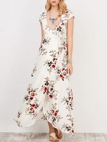 This white wrap dress is having a red colour floral print. The dress is having a cap sleeve and nice curve shape is given at the bottom of this dress. This dress can be treated as formal wear which will give you comfort in summer days.