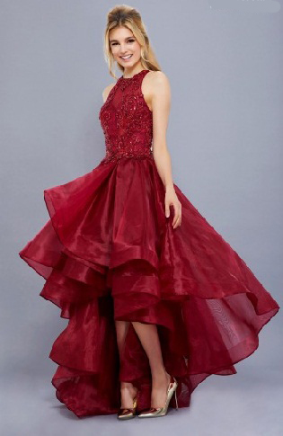 This is an exotic collection of wine-red high-low dresses with multiple flares. It is also sleeveless with a natural waistline, a normal bust pattern, and a unique neck design. This one looks heavy but is the best choice for any ceremony function.