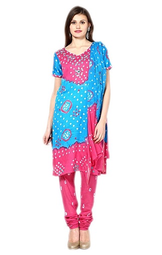 - Design: Pink and Blue Bandhani Salwar Suit with Short Sleeves