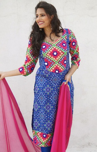 The pink bandhani salwar suit is the most common variant we have often come across. This new-day fashion wear is a mix of pink and blue options that look quite trendy. It retains the traditional look by sticking to casual simple mirror work here and there.