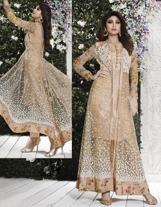 This is a gorgeous frock coat design that you can wear with Anarkali suit. This is made of net material and it is beautifully decorated with floral embroidery. Also, it comes with lace border and rasham and stone work. You can wear it for parties and functions. This dress will make you look extraordinary.