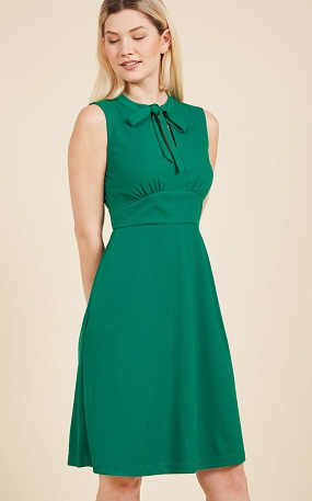 Let’s now take a glimpse at this lovely vintage-style frock. This A-line dress pattern has a round neck with a flared A-line silhouette. At the waist is a slim belt. The cotton blend dress is knee-length and sleeveless. This outfit is a seemingly perfect one for Sunday church, parties and get-together events.
