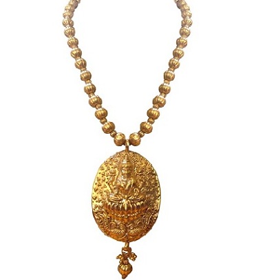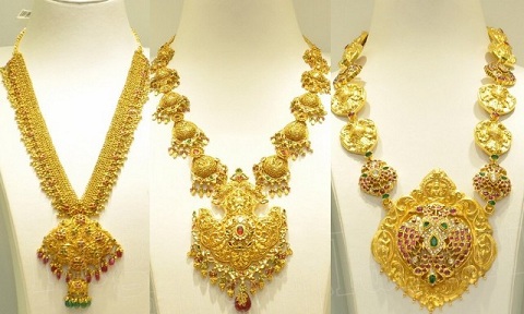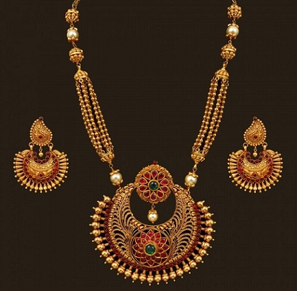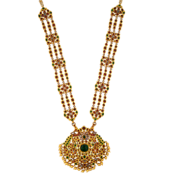 Long chains are extremely popular in antique jewellery. They can be pure gold with big temple designs as pendants and Goddess/Gods images. They can also have diamonds, Kundan work, Polki work done on them for added antique finishing. They can be worn with nice handloom attire to highlight antique jewellery.