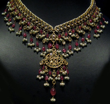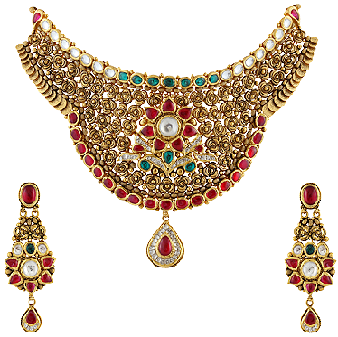 Kundan is a very popular and important piece of jewellery in gold designs for weddings and other traditional occasions. It is a form of traditional Rajasthani jewellery. Kundan jewellery is a work of expensive stones in green, maroon or red and diamonds in gold. Antique Kundan gold jewellery completes the bridal look of a woman. A lot of hard work and craftsmanship is involved while making antique Kundan jewellery.