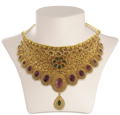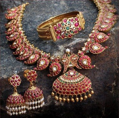 Ruby stones have been used a lot in making antique jewellery. Jewellery made years back used lots of precious stones in green and red to give jewellery an eternal feeling. Necklaces and jhumka sets in rubies and gold with that antique look can be just perfect for that traditional wedding look. Antique necklaces have a nice fall on the neck as they are heavy and look good when paired with traditional wear.