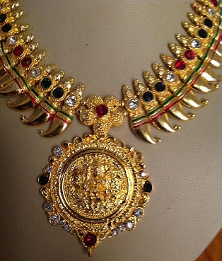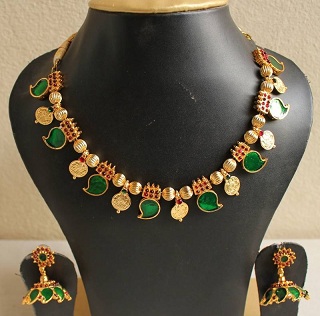 These traditional Kerala styles leaf-patterned necklaces are known as Palakka. The antique leaf necklace is made from small green expensive stones with red rubies on top and is then beautifully worked to be made into a necklace or a chain. This has a matching set of earrings in the same pattern too. These go very well with traditional white saree with a golden border, better known as Kerala saree. They have a lot of value attached to it.
