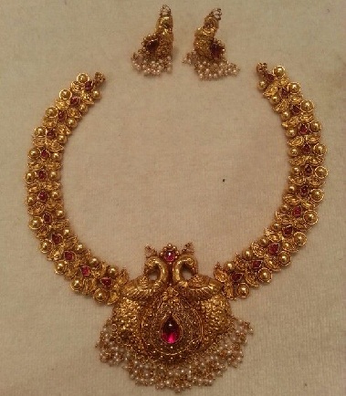 Bright colours of ruby and the amazing colours of peacock captured brilliantly in a choker; imagine; and can anyone say no to this antique jewellery choker. They look like they are made in heaven with that shine, lustre and brilliance of gold, rubies with peacock designs and colours on the necklace.