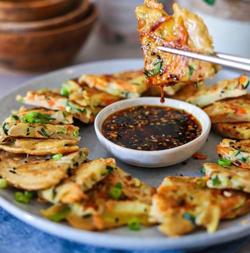 This is another version of Korean pancakes and is called Haemul Pajeon. This is made up of sea food, vegetables and egg. These are traditionally eaten for breakfast and are extremely delicious. They are also known for their soft and chewy texture with lot of sea food popping into the mouth.