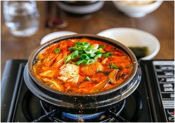 Also called Sundubu-jjigae, the traditional version of this spicy tofu and sea food is prepared in a large stone bowl. IT is made up of tofu, vegetables, sea food , pork or beef, mushrooms and a special chilli paste called gochujang. You can also add a fried egg on top of this stew for extra flavour.