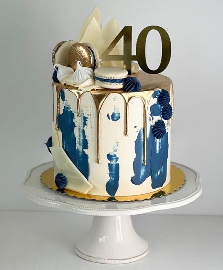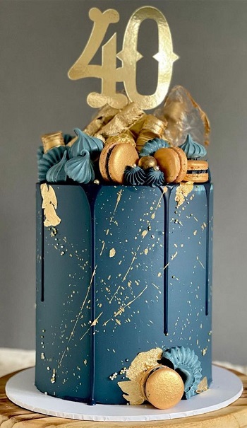 Check out this drip cake for your 40th birthday, which looks quite an aesthetic masterpiece in your party pictures. The cream and blue cake is a perfect package of taste and elegance with its unique brushstroke effect. The thick, golden drip cascading down is sure to make your mouth water with its drool-worthy effect. Elements like macarons and meringues are strategically placed to add that delightful crunchiness to the otherwise creamy cake.