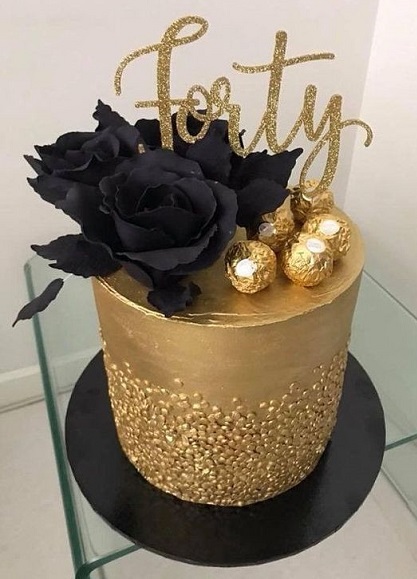 Check out this elegant 40th birthday cake that sets the tone for your much-awaited celebration. The gold-themed cake is adorned with rice crisps or chocolate melts dipped in edible gold paint to provide an interesting texture. The standout feature is the black fondant rose topper that creates a wow factor and adds a touch of glamour. Lastly, a gold topper accompanied by some gold-covered treat transforms this cake into an amazing centrepiece for your party.