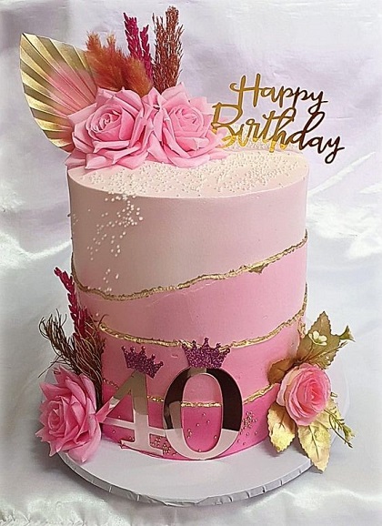 Every detail of your 40th birthday should feel personal and uniquely yours. Here is a cake that reflects the richness of a life well-lived. The stunning white two-tier masterpiece steals the spotlight with its elegance. Delicate pink florals adorn the cake; each bloom adds a touch of fragrance and charm to the cake. This cake celebrates all the moments, big and small, that have shaped the journey so far.
