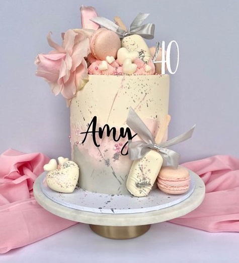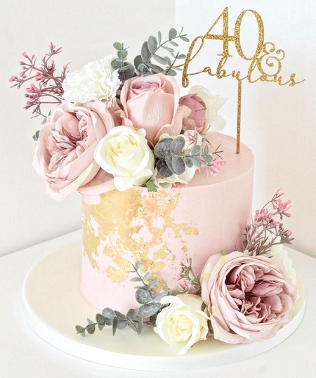 Check out this cake that gives cake goals to everyone around you. The 40th birthday cake design features soothing hues of cream, grey, and pink that set just the right vibe. The top is adorned with crunchy and chewy treats which add layers of texture and taste to the experience. Fresh blooms delicately placed elevate the charm to a whole new level and make your birthday moment special.