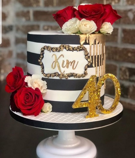 Transport yourself to the past with a retro-themed 40th birthday cake that is sure to grab everyone’s attention. Bold black and white stripes create an instant nostalgic charm and evoke wonderful memories of the yesteryears. The addition of gold and red elements adds a touch of allure and makes it picture-perfect. The addition of fresh roses, golden drip, and a personalized name plaque make this cake an absolute showstopper for the celebration.