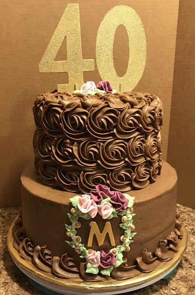 This 40th birthday cake design is a pure heaven for chocolate enthusiasts. The top layer boasts creamy chocolate swirls that dance on your taste buds, providing a mouthful of deliciousness. Slicing into the cake reveals layers of moist chocolate sponge generously filled with velvety chocolate buttercream. You can also consider personalizing the cake with an initial to add a special touch and elevate the party vibes.