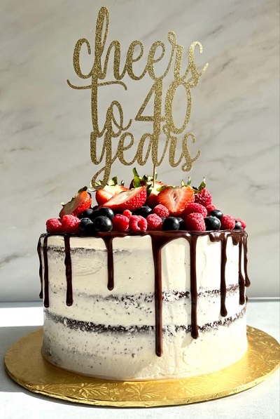Don’t get fooled by the minimal decoration of this 40th birthday cake design, as its high flavour profile will leave you mesmerized! The moist sponge cake is adorned with just a hint of buttercream frosting to give the right amount of sweetness. A luscious chocolate drip adds a layer of richness while loads of fresh berries infuse a burst of colour and tanginess to balance the sweetness of the cake.