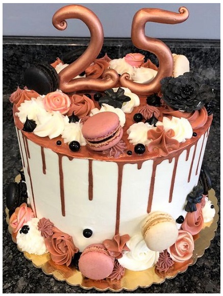Look no further than a drip cake to add a wow factor to your 25th birthday party. While it may appear like an ordinary cake at first glance, a drip cake makes a difference with its decadent chocolate dripping down the sides. The mere sight of this cake is enough to gather everyone for a cake-cutting ceremony, as everyone wants the best piece. You can take it to the next level by adding delicious elements like macarons and cream piping.