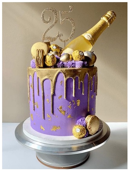 What’s a 25th birthday party without some champagne spray? We can take this idea to the next level with a design that blends the deliciousness of a cake with the bubbly joy of champagne. Loading it with sweet treats adds an extra touch of yumminess to the cake and makes it irresistible. As a final touch, you can think of a luxurious golden drip for an ultra-glamorous look.