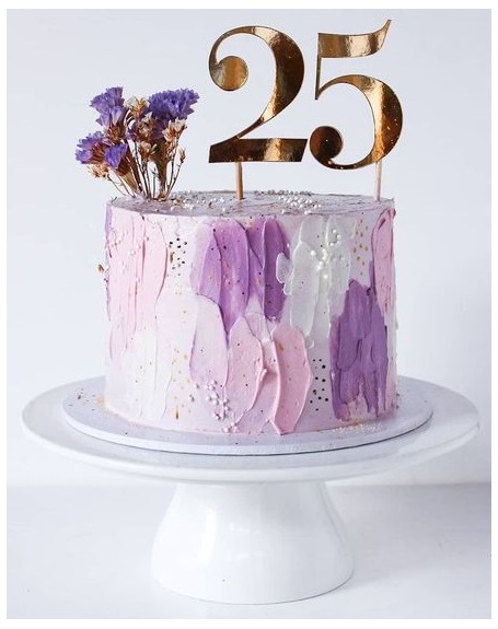 If you are looking for an elegant cake design that speaks volumes about your refined taste, here is an idea for inspiration. With a unique butter knife-painted frosting, the cake features a textural effect that is visually stunning. The artistic blend of different shades adds depth while creating a wow factor. Using bold toppers gives that extra flair and ties everything together for a memorable 25th birthday celebration.