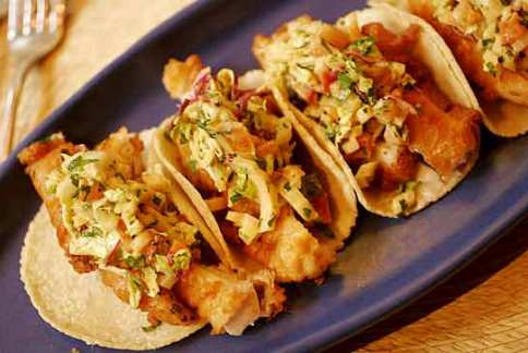 To make fish tacos first start with the beer batter made of beaten eggs, baking powder, flour, cornstarch and beer. Now slightly dip the fish in flour and beer batter before frying it thoroughly. Next make the white sauce out of cheese and mayo with jalapeno bits and lime juice and then use it as the sauce for the taco.